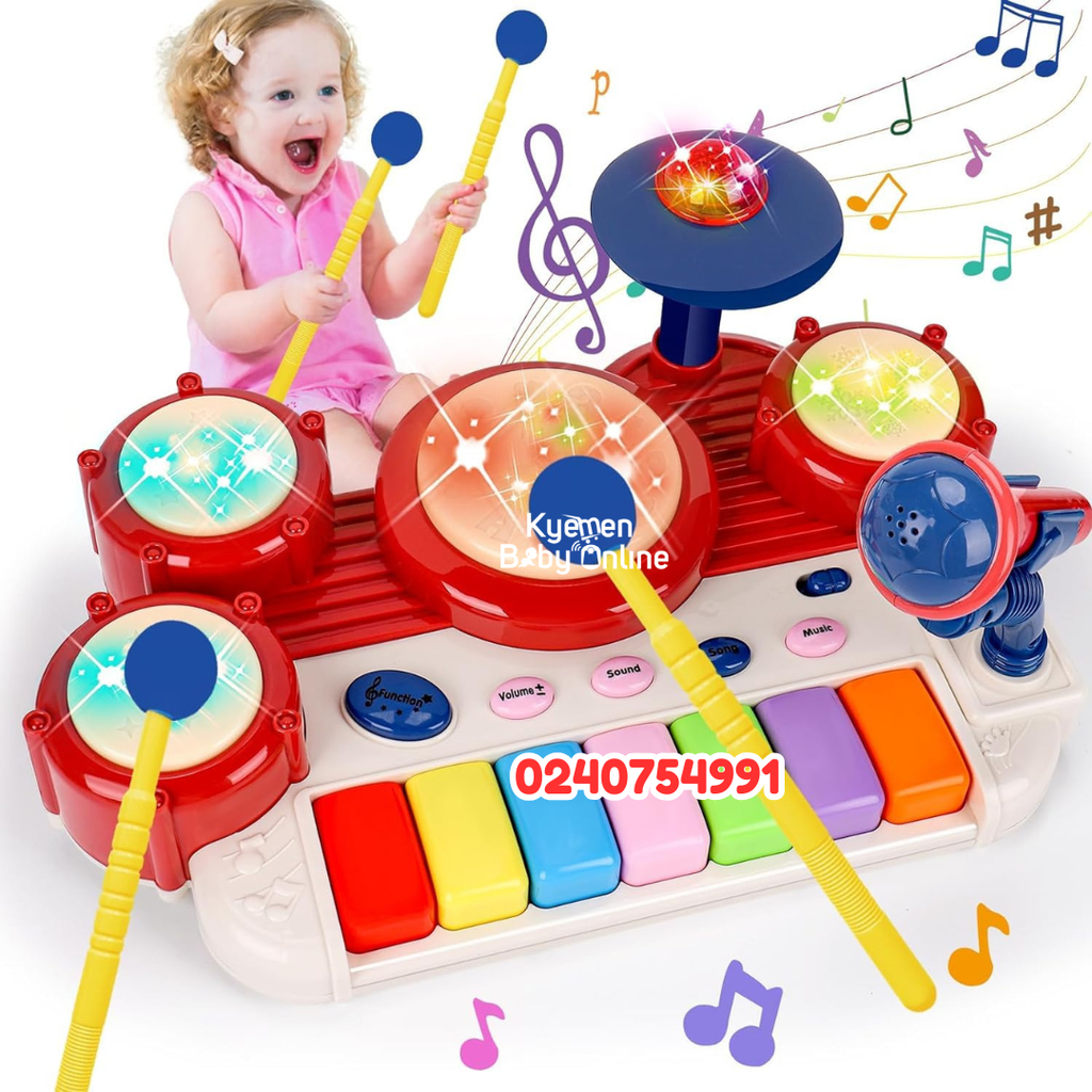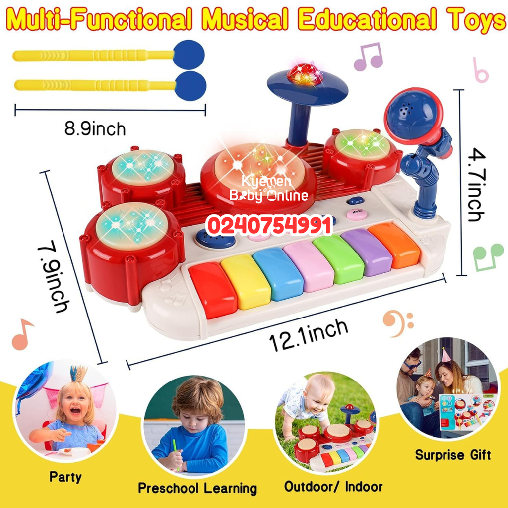 • Interactive Musical Drum Set: This hand drum is a fun and interactive that allows to explore different sounds. It features 4 drums, 1 cymbal, and 7 piano keys, offering a variety of ways to create music and rhythms.
