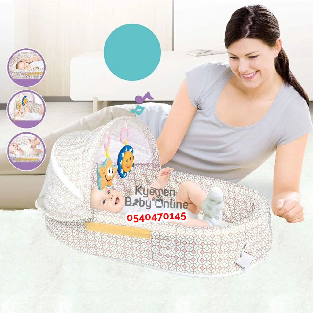 - This travel baby bassinet comes with toys and music to make baby happy.