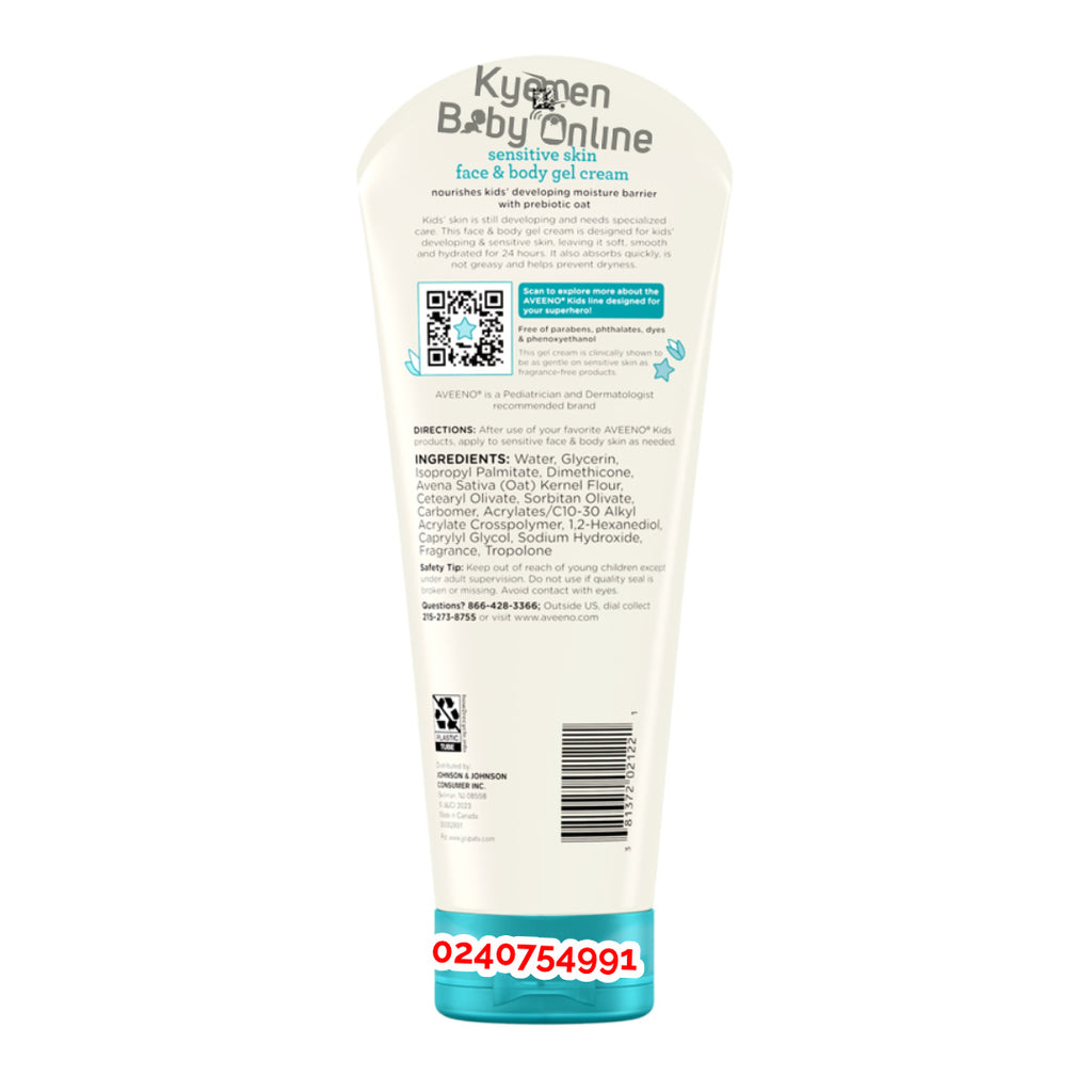 Aveeno Kids Face And Body gel cream with prebiotic oat provides gentle and nourishing care for your child's delicate skin. Made with natural ingredients, this cream helps maintain the skin's natural moisture barrier and keeps it soft, smooth, and hydrated. Perfect for daily use, this gel cream is suitable for all skin types.